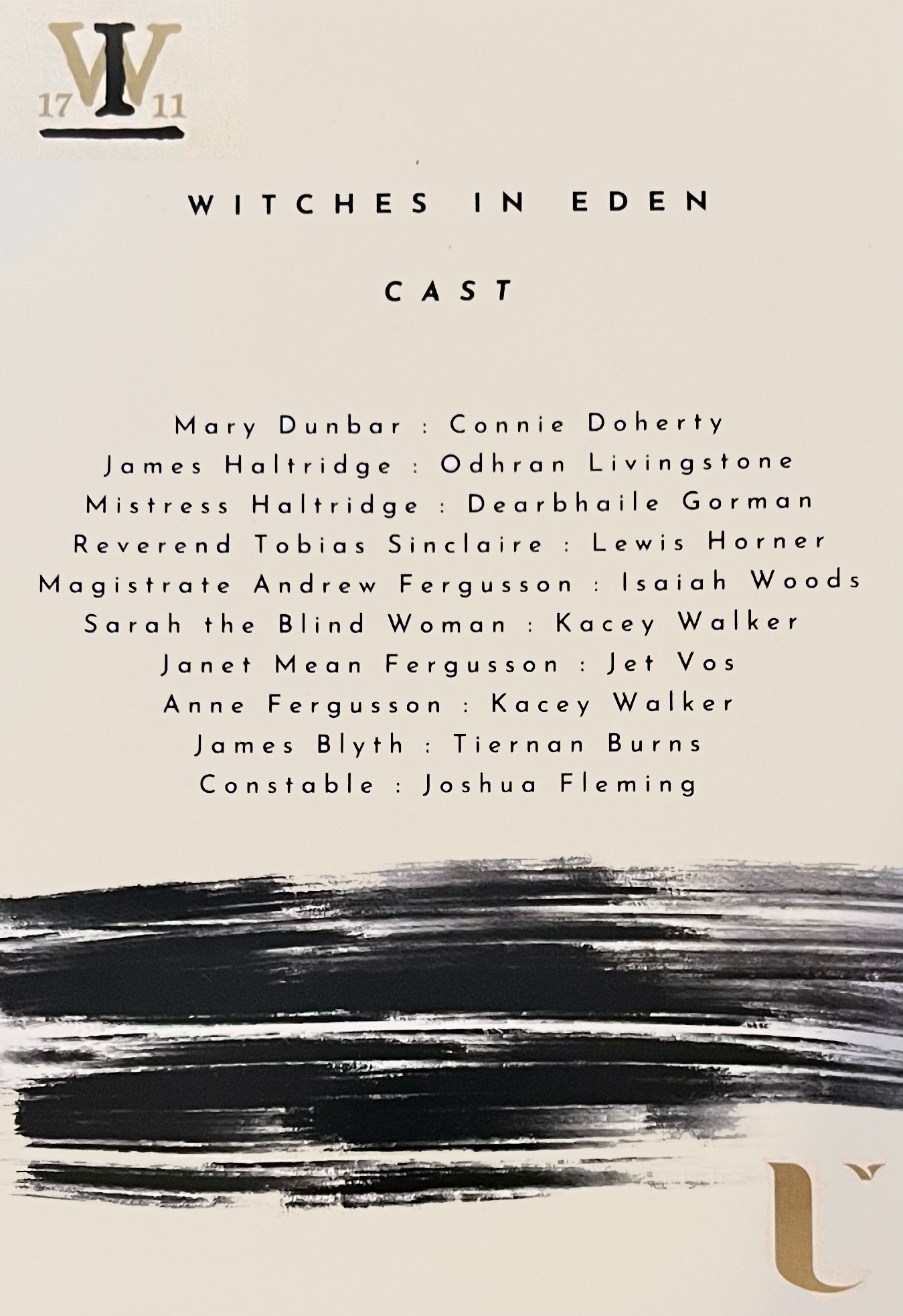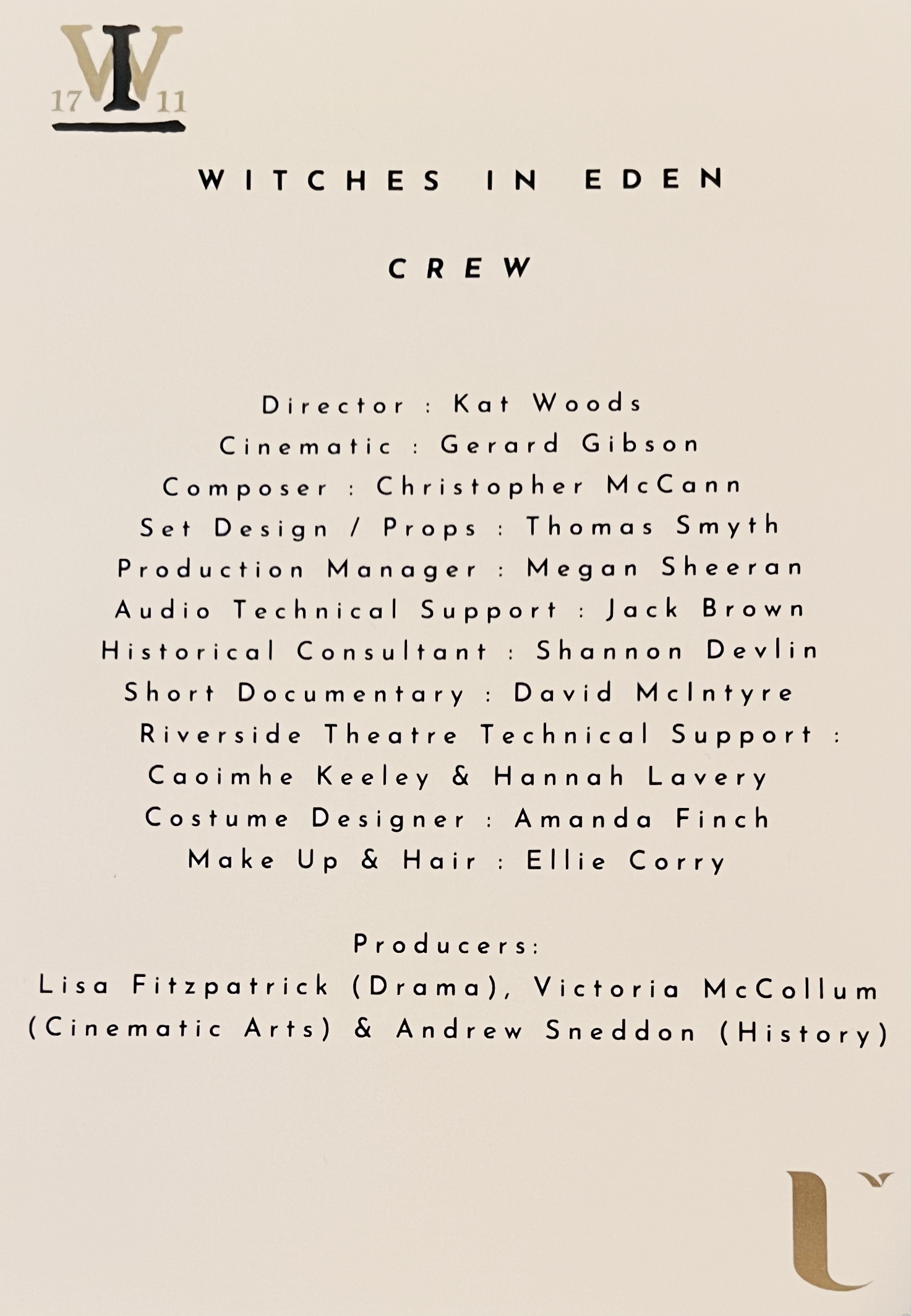 This multidisciplinary play, using words, cinematics, animation, music and VFX, allows audiences to experience the history of the trial while imagining the lives of the accused. This one-act play about the Islandmagee trial, Witches in Eden, was written by Belfast playwright Olga Fielden in 1948. The gender politics of Fielden’s play, its approach to historical accuracy, and the positioning of the witches as victims prefigure Arthur Millar’s The Crucible (1953). This is a story of murder, magic, the devil, and a community in crisis. It offers a unique glimpse into how the ‘witch hunts’ that claimed over 40,000 lives in Europe played out on Irish shores. Premiered on Halloween, 2023: Riverside Theatre, Coleraine.