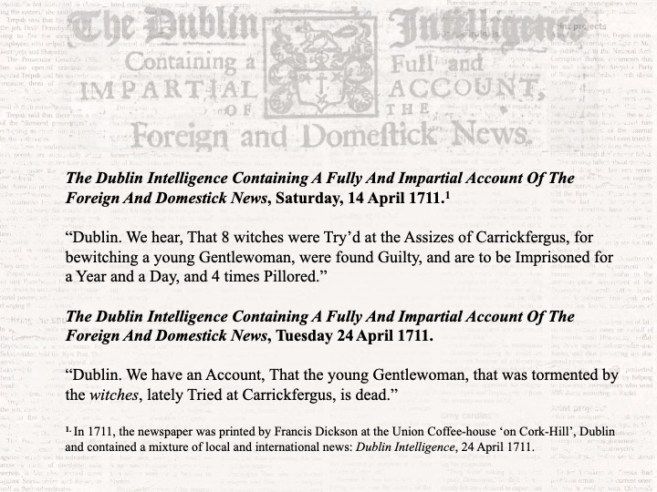 The trials of the nine Islandmagee ‘witches’ took place in March and September of 1711, in Carrickfergus, County Antrim. They were Ireland’s last witch trials held under a dedicated witchcraft law, the Witchcraft Act of 1586.